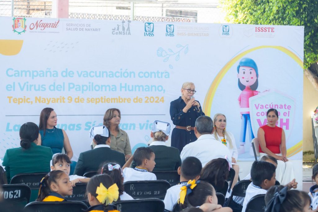 Tepic, Nayarit; 9 de septiembre de 2024.- En su continuo esfuerzo por proteger y garantizar la salud de las niñas, niños y adolescentes de la entidad, la doctora Beatriz Estrada Martínez, presidenta del Sistema DIF Nayarit, encabezó el arranque de la Campaña de Vacunación contra el Virus del Papiloma Humano (VPH) 2024, en la escuela primaria General Narciso Mendoza en la capital nayarita, en lo que será una jornada que llegará las niñas de quinto año de las instituciones educativas de nivel básico en todo el estado, con un total de 11 mil 533 vacunas.