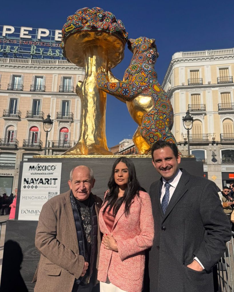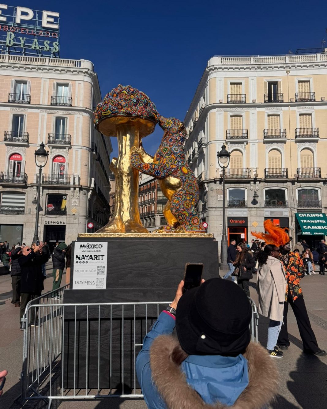 En la Puerta del Sol se develó una intervención del emblemático Oso y el Madroño elaborada con arte wixárika por artesanas y artesanos de Nayarit.