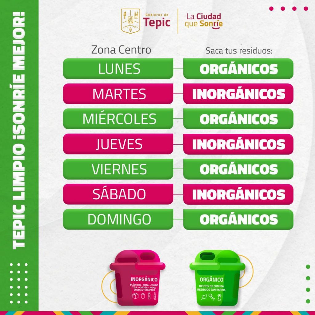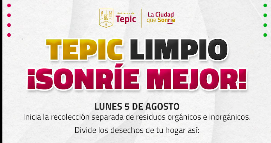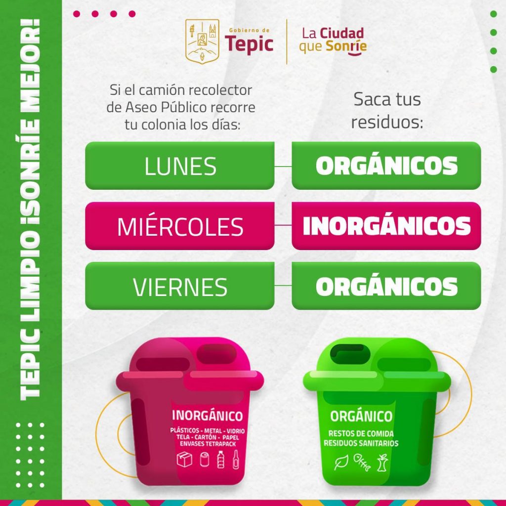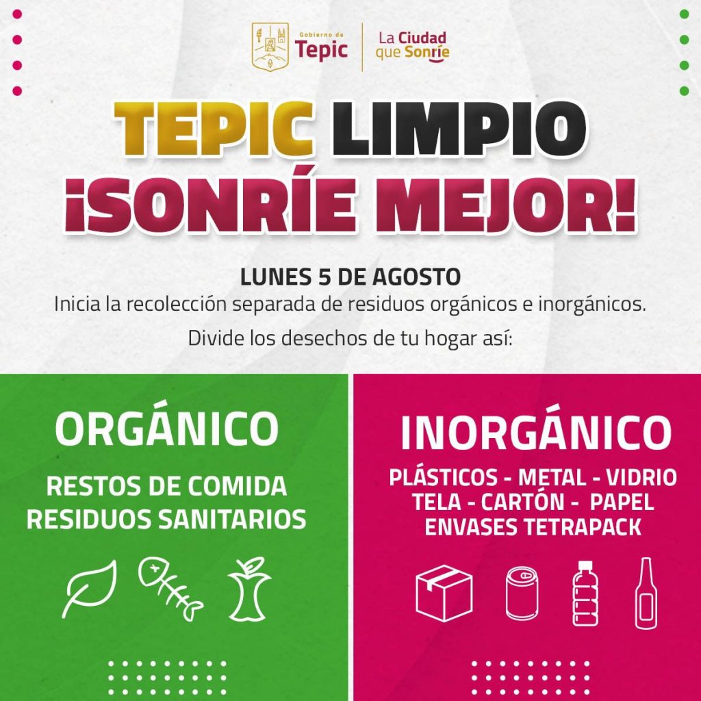 El Gobierno de Tepic informa que a partir del próximo lunes 5 de agosto del año en curso, habrá nueva manera de recolección de basura con separación de desechos orgánicos e inorgánicos en la ciudad.