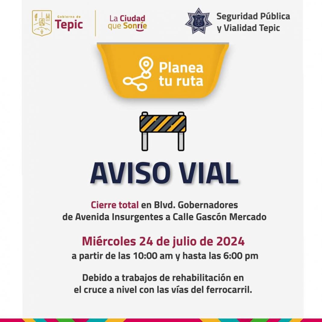El día miércoles 24 de julio del año en curso, de De 10:00 am a 6:00 pm, habrá un cierre total en Blvd Gobernadores, desde avenida Insurgentes hasta calle Gascón Mercado, de Tepic, debido a trabajos de rehabilitación en el cruce a nivel con las vías del ferrocarril.