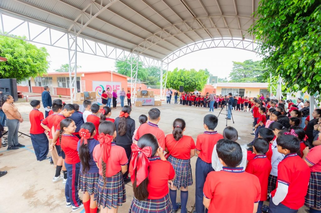 Santa María del Oro, Nayarit; 8 octubre de 2024.- Con el compromiso de otorgar una mejor calidad en la educación de las niñas y niños del estado, la doctora Beatriz Estrada Martínez, presidenta del Sistema DIF Nayarit, encabezó la entrega de 20 computadoras para el equipamiento de un aula de cómputo que beneficiará a las y los alumnos de la Escuela Primaria «Niños Héroes», de la localidad de San José de Mojarras, municipio de Santa María del oro.