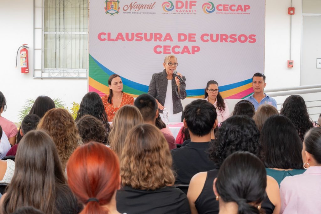 Tepic, Nayarit; 18 de agosto de 2024.- En un emotivo acto de clausura, la doctora Beatriz Estrada Martínez, presidenta del Sistema DIF Nayarit, encabezó la ceremonia de fin de cursos de verano, ofrecidos por el Corazón de Tu Gobierno a través del Centro de Capacitación (CECAP) DIF, del que egresaron 186 estudiantes.