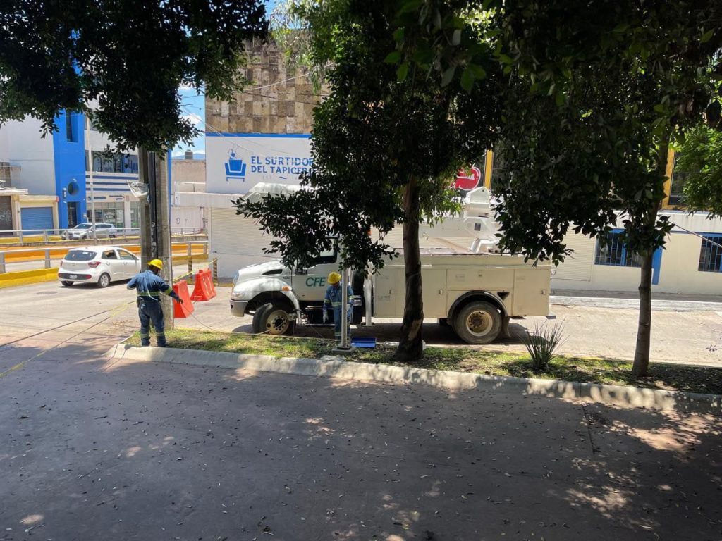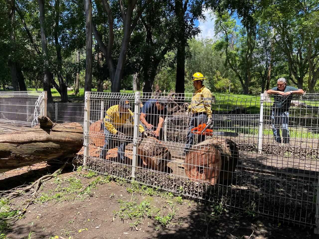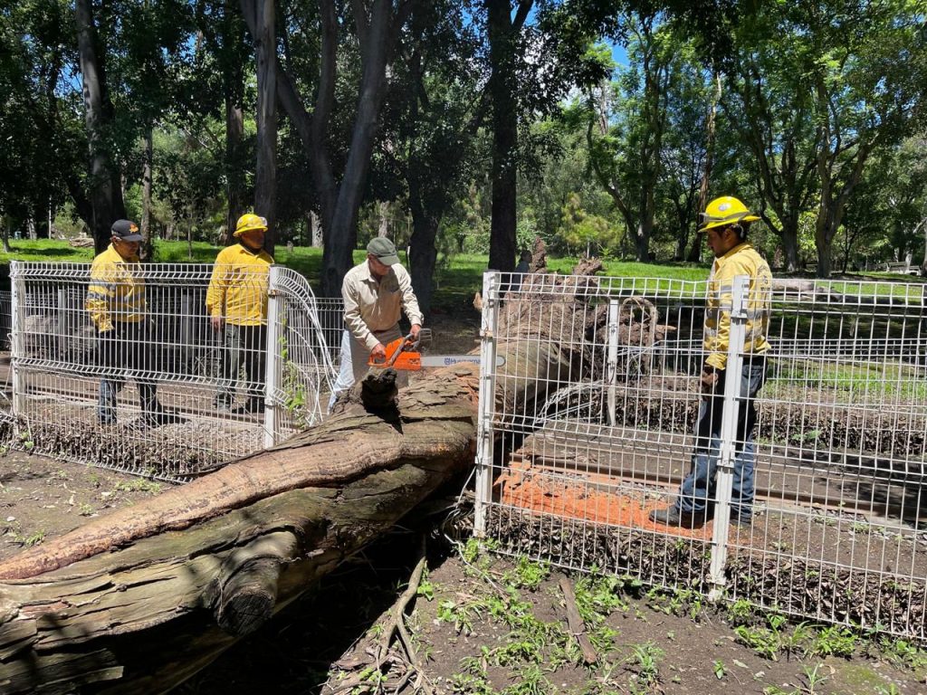 En el Parque la Loma de Tepic, las brigadas de la Secretaría de Desarrollo Sustentable, de la Comisión Federal de Electricidad (CFE) y del propio parque, atienden la caída de un árbol que bloquea las vías del trenecito.