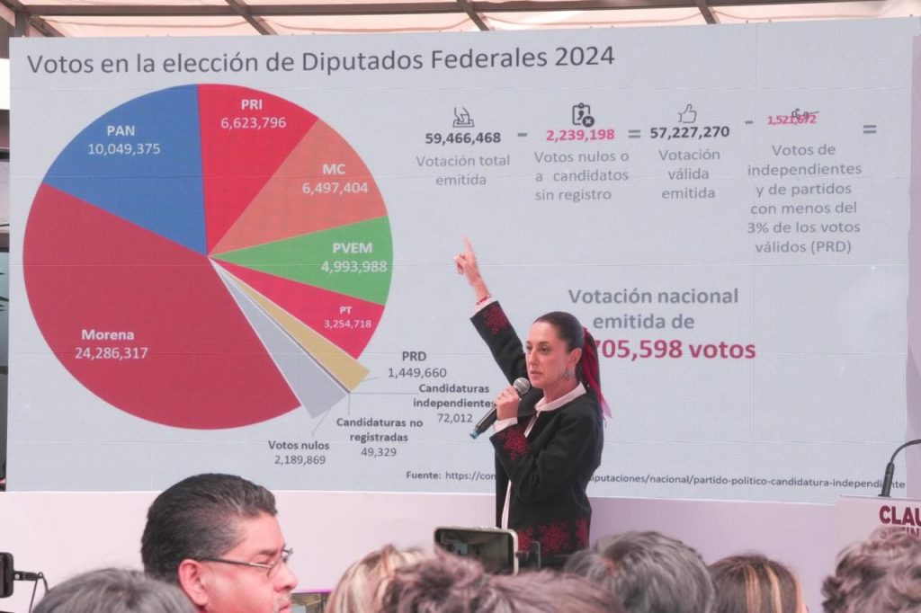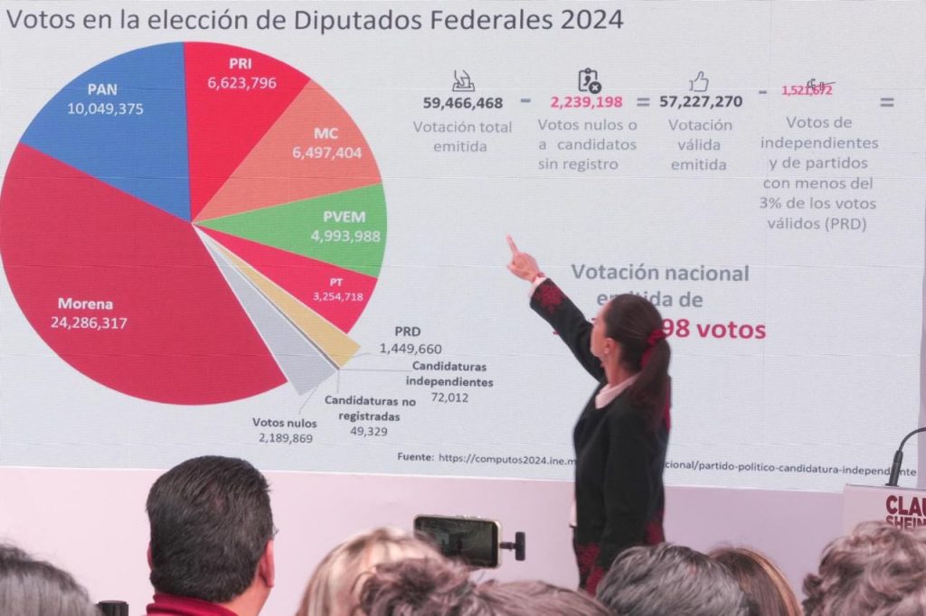 Ciudad de México; 19 de agosto de 2024.- Con el objetivo de hacer respetar las leyes electorales y la voluntad del pueblo, Claudia Sheinbaum Pardo, presidenta electa de México, explicó el proceso de repartición de diputaciones federales de representación proporcional y puntualizó que no existe una sobrerrepresentación de Morena en el Congreso de la Unión, como lo acusa la oposición.