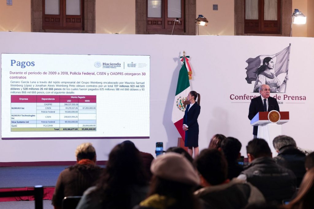 Detalló que con estos contratos se pagaron 625 millones 188 mil 677 dólares y 93 millones 866 mil 666 pesos a empresas vinculadas al consorcio que encabezó Jonathan Alexis Weinberg Pinto, montos que fueron pagados a cuentas en Israel, Barbados y México, a las empresas del consorcio constituidas en Panamá que operaron en territorio mexicano.