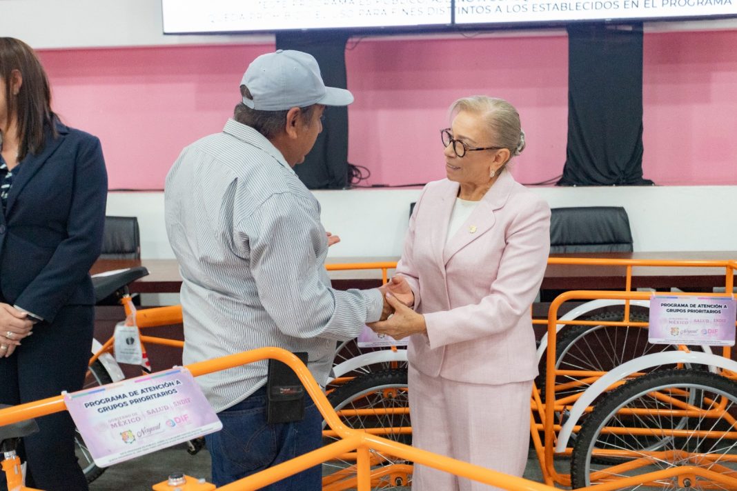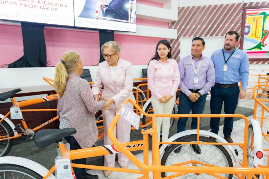 La señora Ma. Trinidad Tiznado Becerra, beneficiaria de la capital nayarita, y quien recibió de manos de la doctora Beatriz Estrada Martínez su triciclo de carga, comentó que ella se dedica a vender elotes y que no se esperaba este apoyo; expresó su emoción y aseguró que nunca se le olvidará este gesto de parte de la institución social.