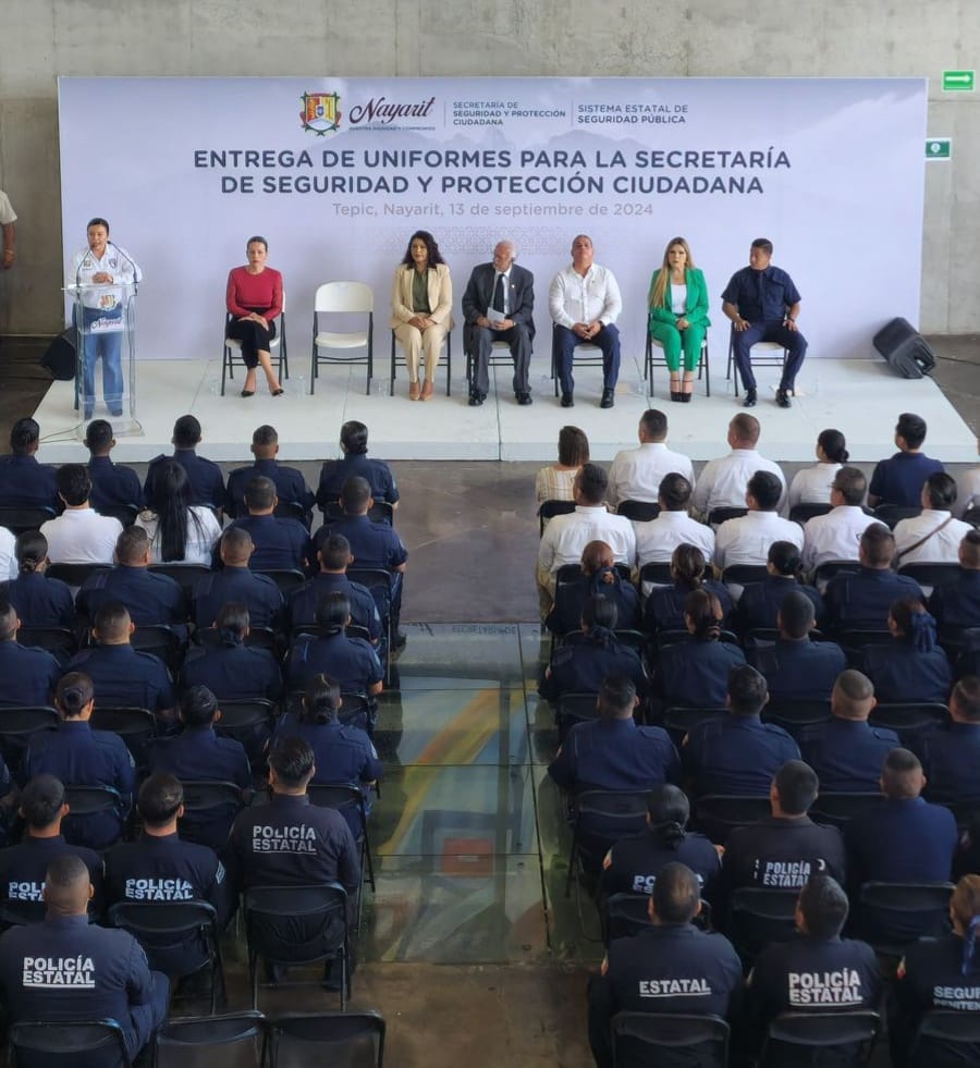 Tepic, Nayarit; 14 de septiembre de 2024.- El gobernador del estado, Miguel Ángel Navarro Quintero, encabezó la entrega de uniformes y equipamiento a elementos de la Policía Estatal. En el evento, el mandatario estuvo acompañado por el secretario de Seguridad Pública y Protección Ciudadana, Manases Langarica Verdín; la secretaria general de Gobierno, Rocío Esther González García; y la secretaria ejecutiva del Sistema Estatal de Seguridad Pública, Adriana Pérez Aguado.