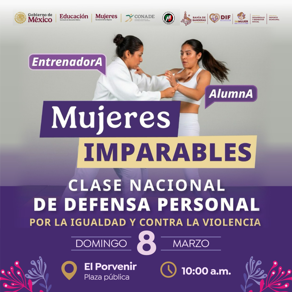 • Clase Nacional de Defensa Personal «Mujeres Imparables»: Se llevará a cabo a las 10:00 a.m. en la plaza de El Porvenir, bajo el lema «Por la igualdad y contra la violencia».