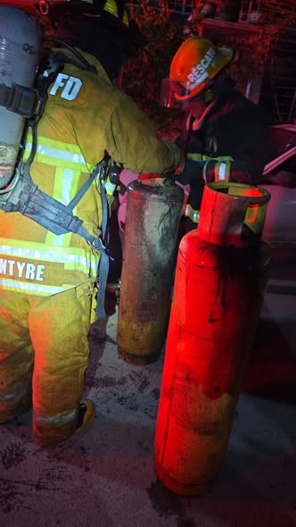 Los bomberos realizaron una inspección inicial para confirmar que no hubiera personas en riesgo, posteriormente iniciaron las labores para sofocar el fuego y retirar los cilindros involucrados.