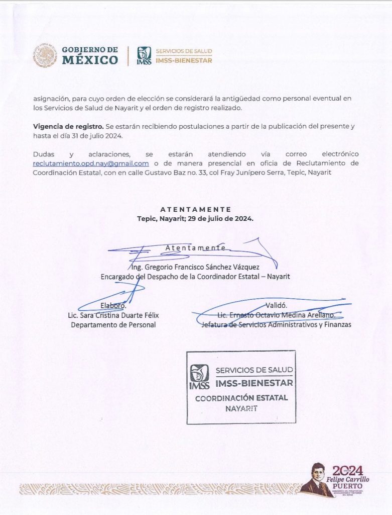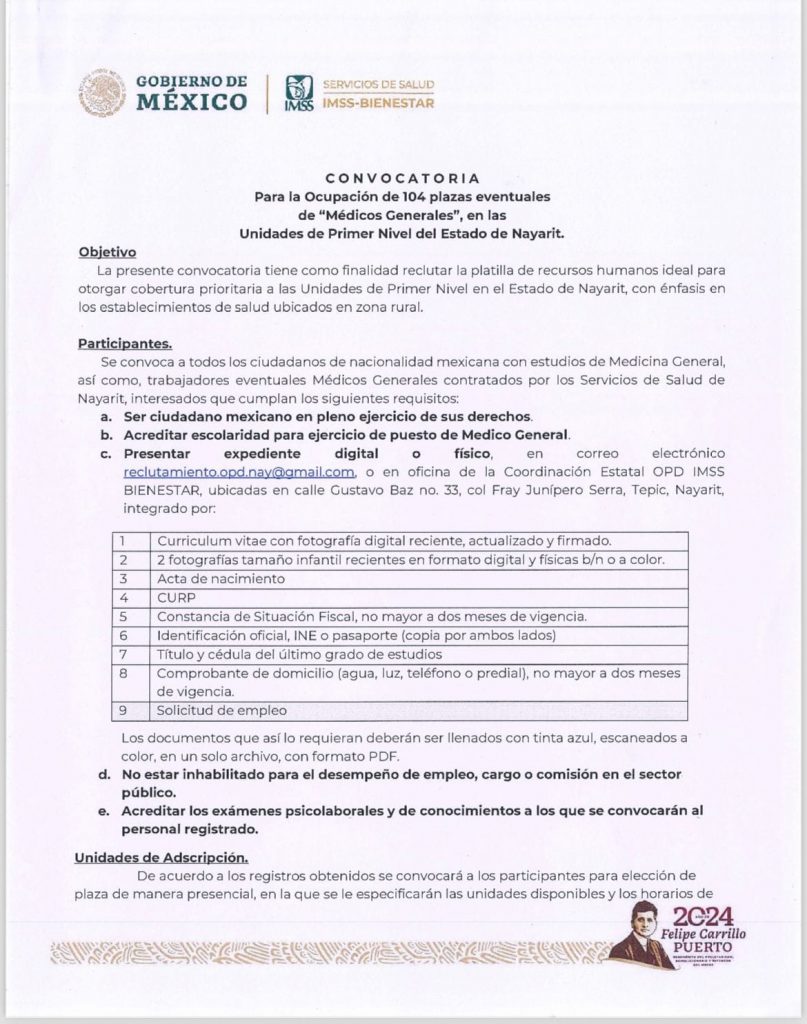 El gobierno del estado de Nayarit comparte la siguiente convocatoria por parte del Instituto Mexicano del Seguro Social (IMSS), para la ocupación de 104 plazas eventuales de médicos generales en las Unidades de Primer Nivel del estado, que buscará fortalecer la atención médica en las zonas rurales, garantizando una cobertura de salud más amplia y eficiente.