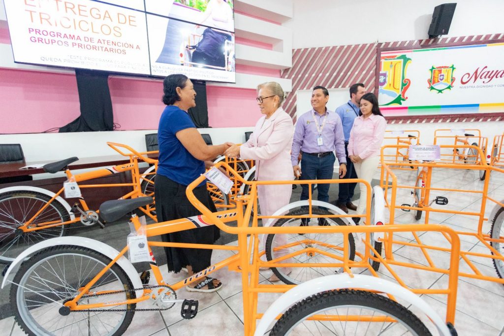 Tepic, Nayarit; 11 de julio de 2024. Impulsar el desarrollo y nivel de vida de los grupos prioritarios es una de las tareas del Sistema DIF Nayarit que preside la doctora Beatriz Estrada Martínez, quien reafirmó su compromiso con las y los nayaritas, al hacer entrega de 78 triciclos de carga para el fortalecimiento del desarrollo laboral de igual número de familias del municipio de Tepic.