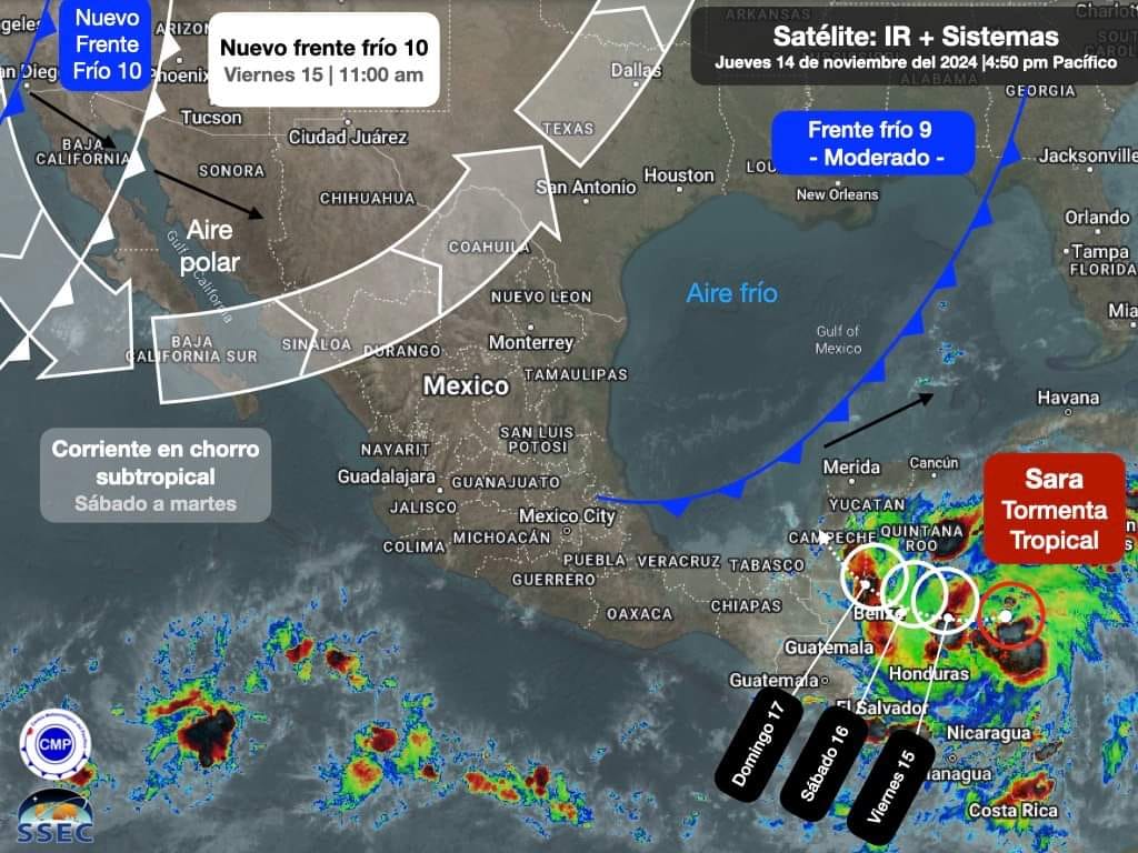 Durante este fin de semana el paso del nuevo frente frío 10 y su masa de aire polar y la corriente en chorro subtropical sobre el noroeste y norte de nuestro país, generara nevadas/agua nieve sobre sierras de Baja California, Sonora y Chihuahua. Además, de lluvias ligeras y lloviznas dispersas sobre Sinaloa, Nayarit, Jalisco y Durango con lluvias máximas acumuladas de 1 a 5 mm, no se prevén condiciones para lluvias fuertes.