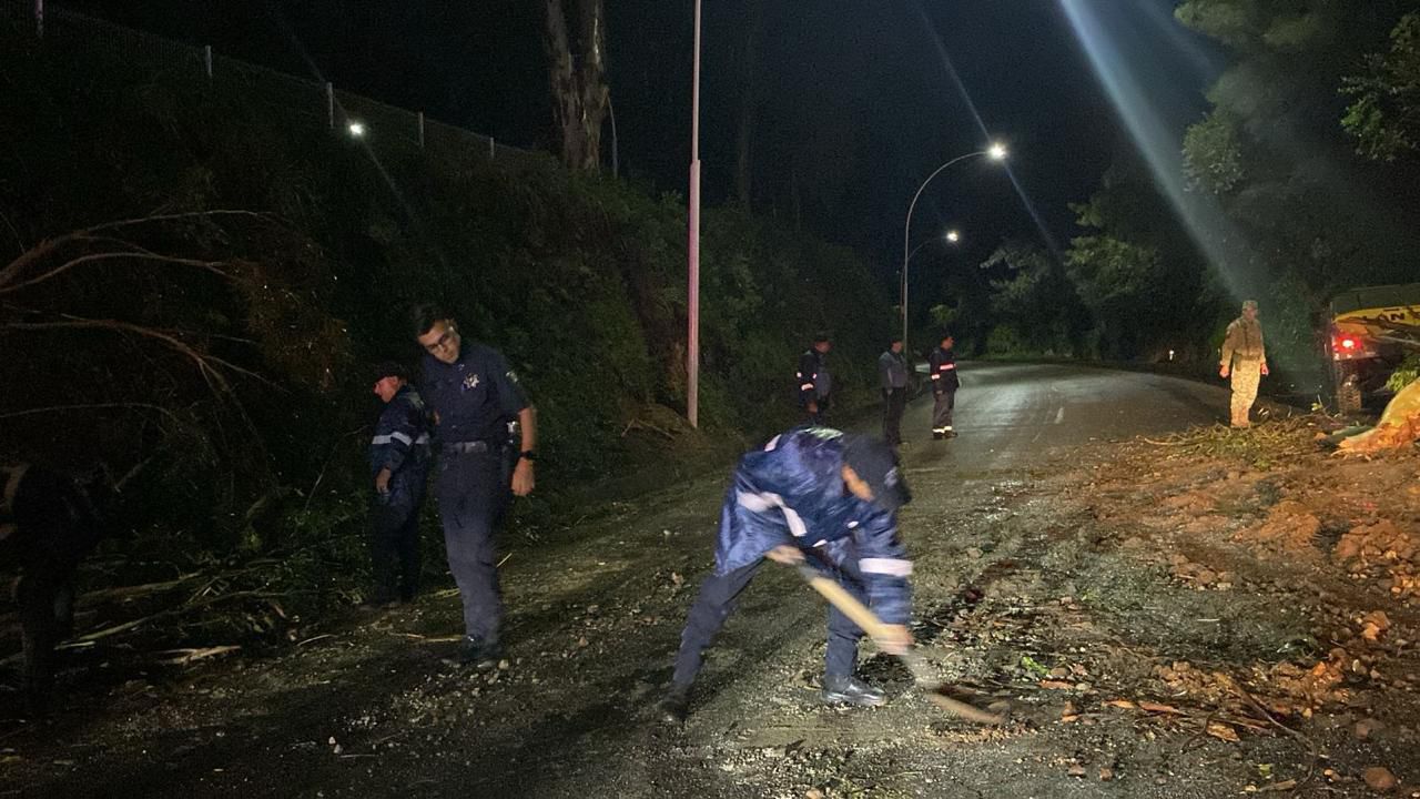 El gobierno de Nayarit, a través de las Secretarías de Seguridad y Protección Ciudadana, Movilidad e Infraestructura, trabajan en distintos puntos de Tepic retirando árboles caídos que la fuerte tormenta combinada con viento derribó en el Libramiento Carretero.