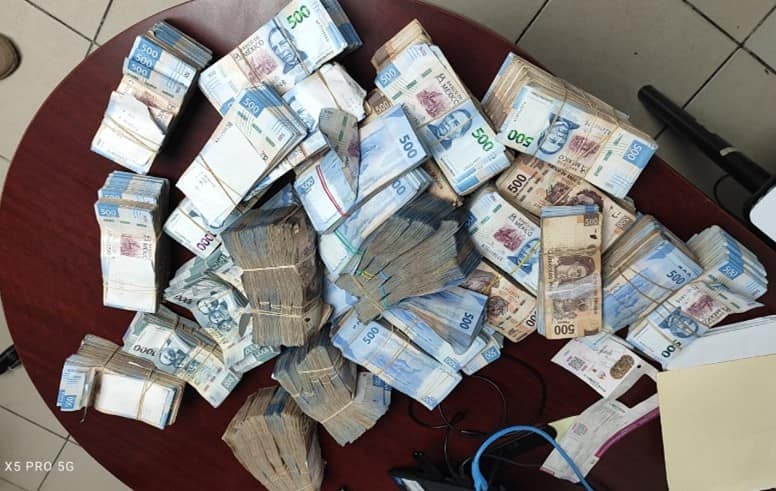 El personal localizó en la cajuela un neumático que mostraba una forma irregular; al moverlo, se identificó que ocultaba algo en su interior, por lo que al efectuar una revisión minuciosa se extrajeron diversas fajillas de billetes de quinientos y mil pesos en moneda nacional, por una cantidad aproximada de cinco millones 700 mil pesos.