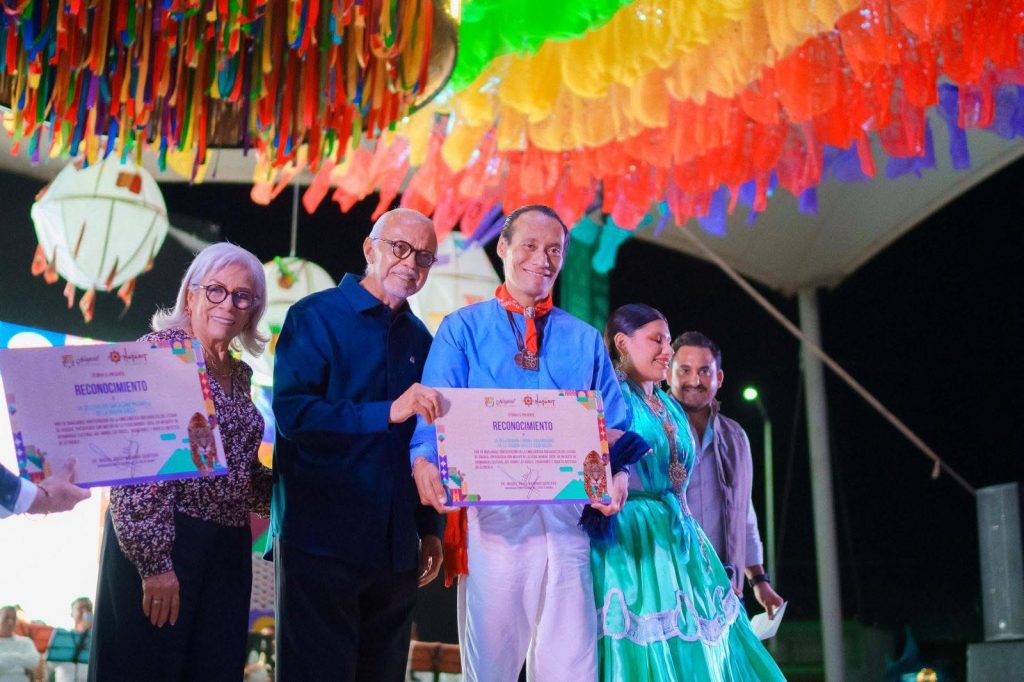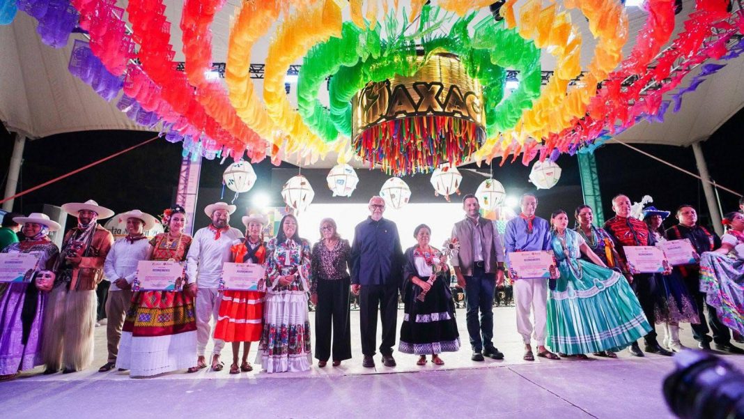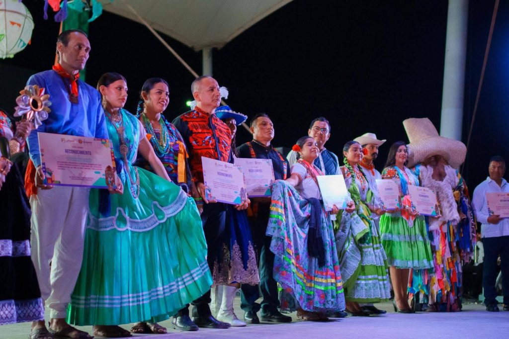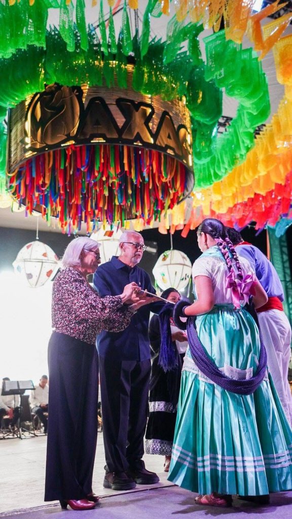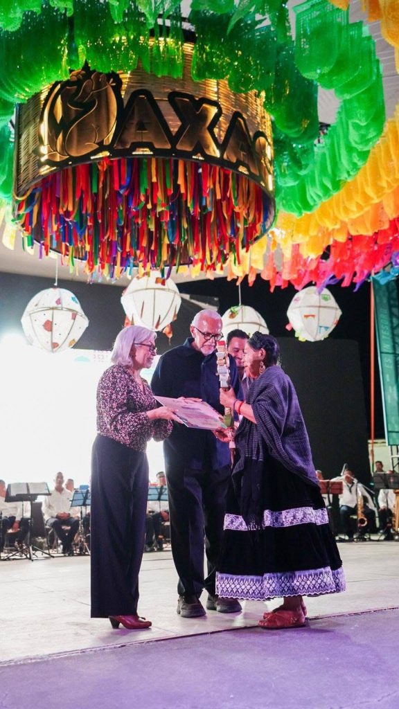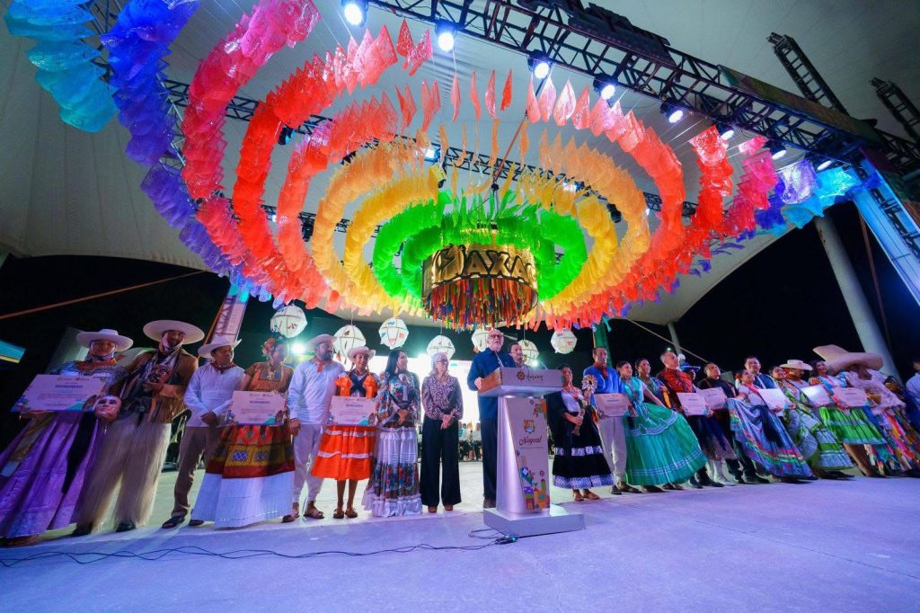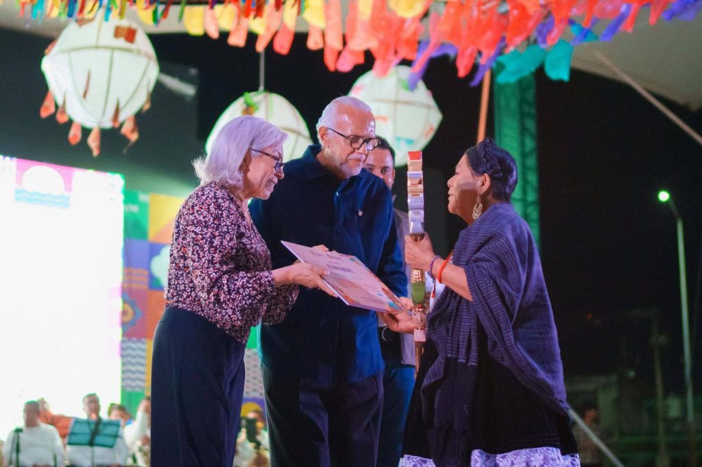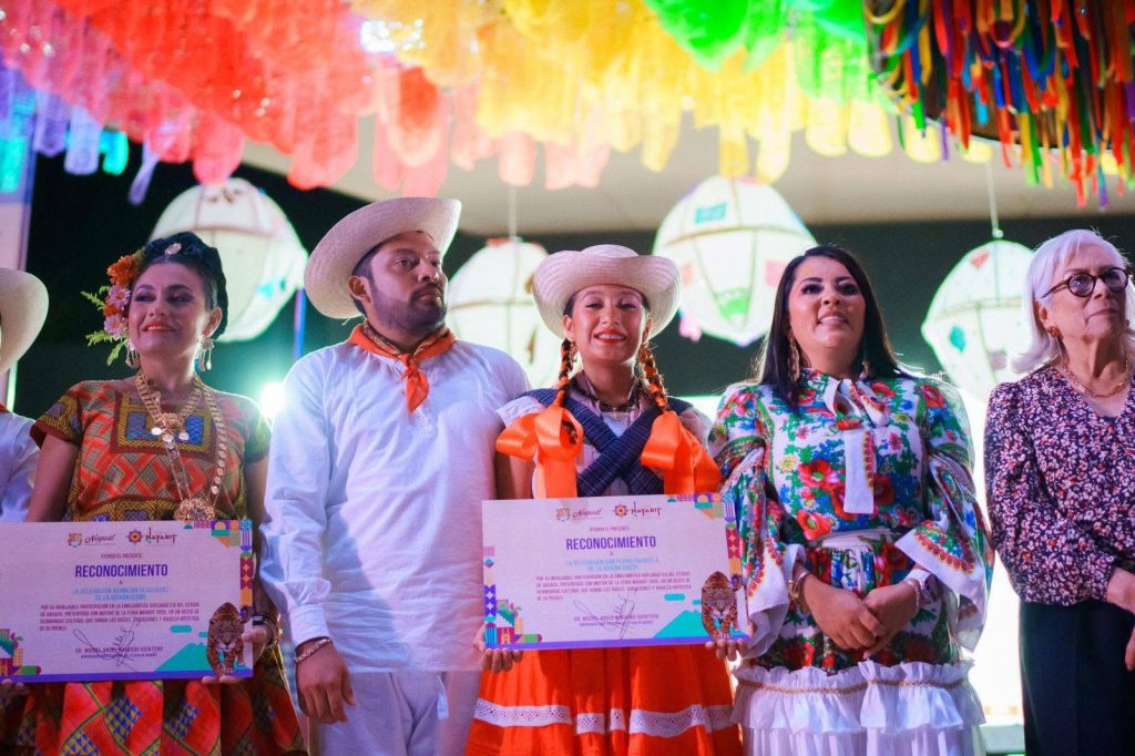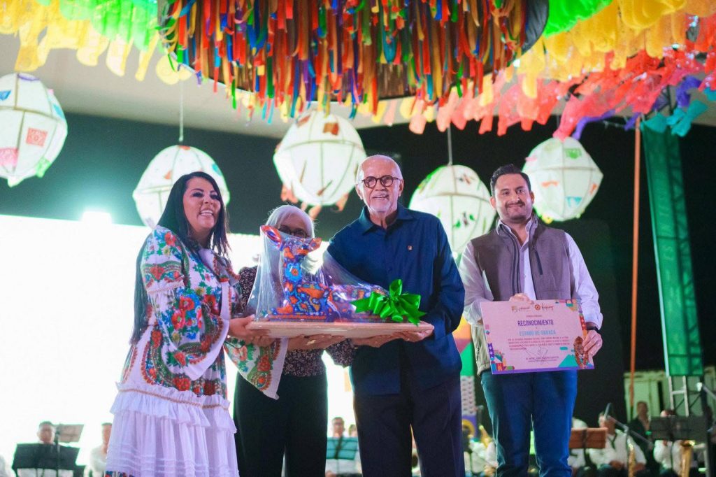 El gobernador Navarro Quintero, junto a la doctora Beatriz Estrada y el secretario de Turismo, Juan Enrique Suárez del Real Tostado, entregó un reconocimiento por su destacada presencia cultural como entidad invitada a la Feria Nayarit 2025 a la secretaria de Turismo de Oaxaca, Saymi Pineda Velasco, así como una artesanía nayarita. También se reconoció a la diosa Centéotl de la región Mixteca, Juana Hernández López, por su invaluable participación en la emblemática Guelaguetza, y a representantes de las diferentes delegaciones de Oaxaca.
