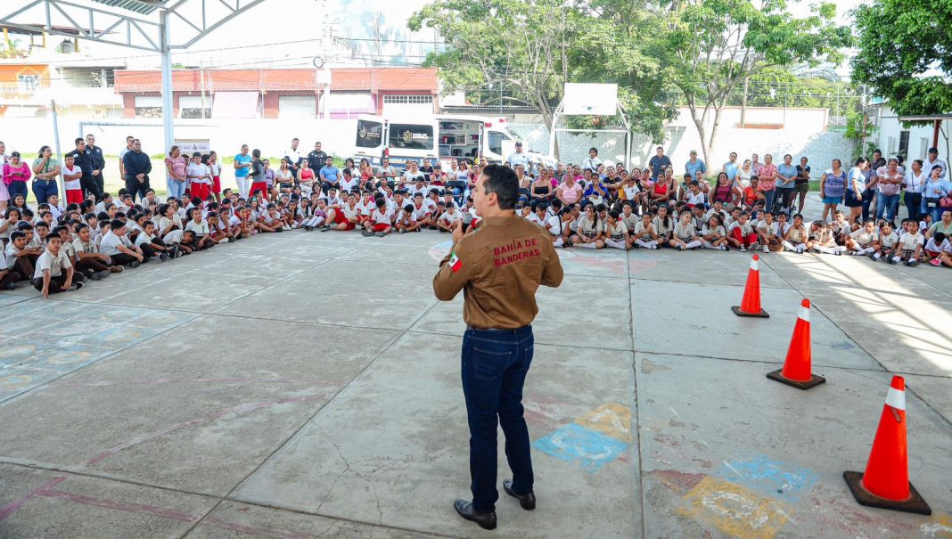 Bahía de Banderas, Nayarit; 26 de septiembre de 2024.- Con el objetivo de fomentar la proximidad entre la ciudadanía y los cuerpos de seguridad, dio inicio la campaña de concientización vial y prevención del delito “Ponte Buzo” en la Escuela Primaria Urbana Federal “Independencia”, ubicada en San Vicente. El evento, que busca mejorar la seguridad en la región, contó con la presencia del presidente municipal, Héctor Santana, quien ha sido un impulsor clave de estas acciones.