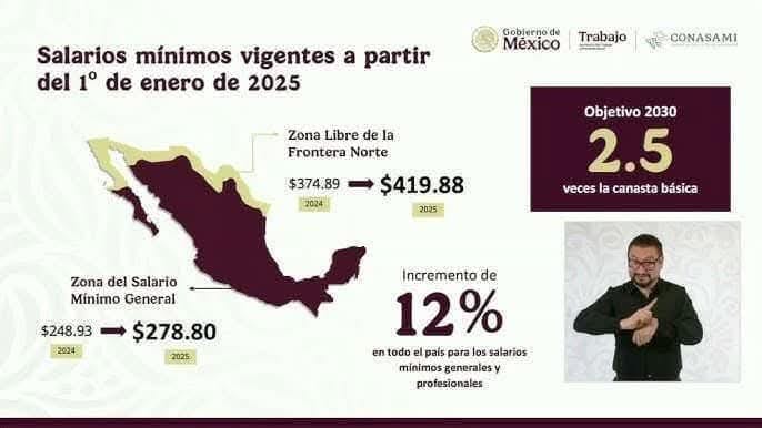 En la Zona Libre de la Frontera Norte, el salario mínimo diario pasará de $374.89 a $419.88 pesos, beneficiando a miles de trabajadores en esta región estratégica para la economía nacional. En el resto del país, el salario mínimo diario se incrementará de $248.93 a $278.80 pesos, marcando un avance sustancial en la lucha contra la desigualdad económica.