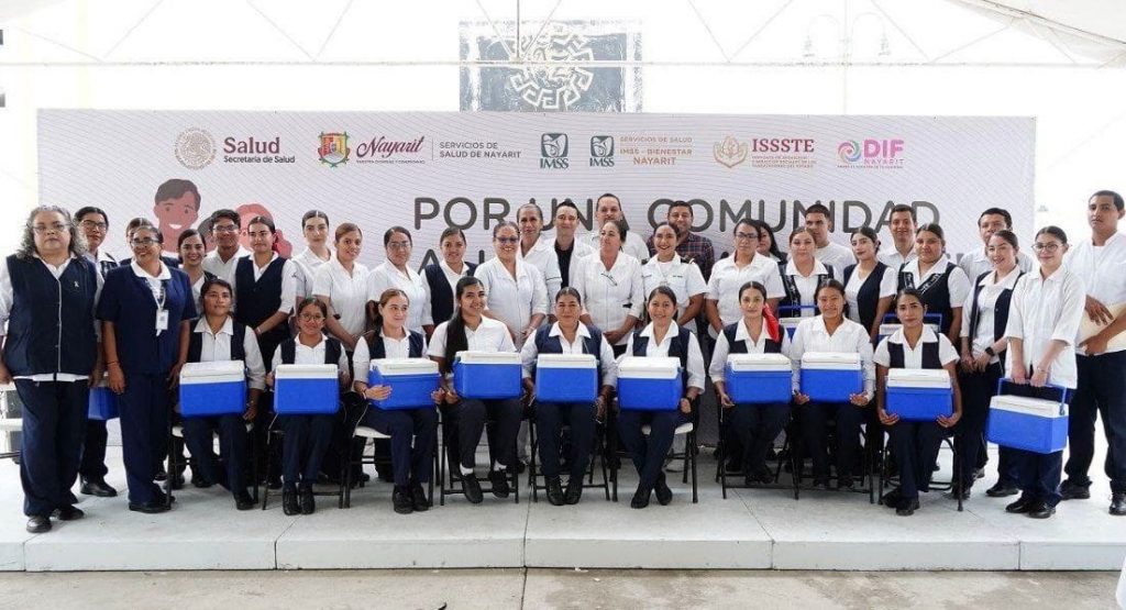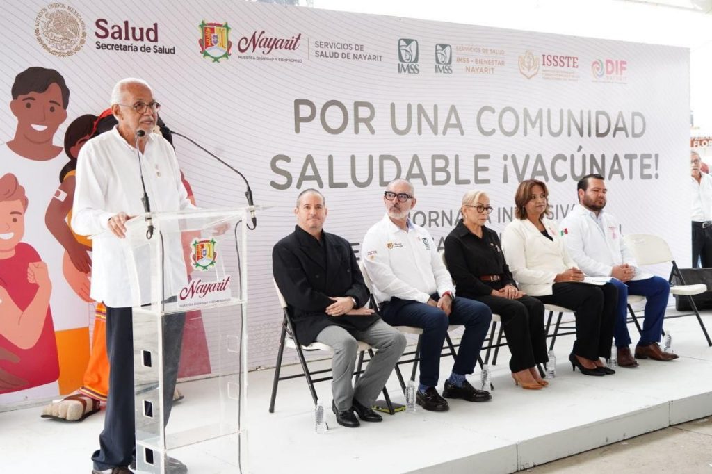 Tepic, Nayarit; 7 de octubre de 2024.-Este lunes, con la presencia del gobernador del estado, Miguel Ángel Navarro Quintero y de su esposa, la presidenta del Sistema DIF Nayarit, doctora Beatriz Estrada Martínez, los Servicios de Salud de Nayarit arrancaron la Jornada Intensiva de Vacunación Intersectorial, bajo el lema: “Por una comunidad saludable, vacúnate”, que tiene como propósito la reducción de la morbilidad y mortalidad por enfermedades prevenibles con la vacunación, así como alcanzar y mantener coberturas de vacunación del 95 por ciento por biológico y 90 por ciento de cobertura con esquema completo en cada grupo de edad.