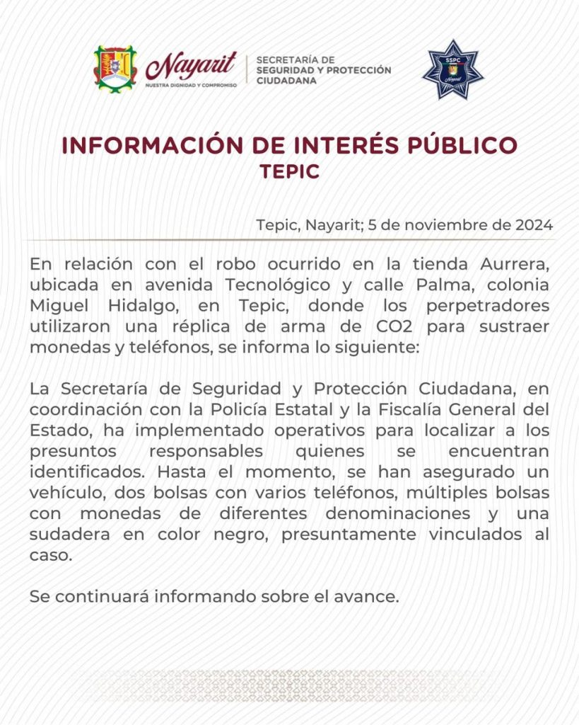 En relación con el robo ocurrido en la tienda Aurrera, ubicada en avenida Tecnológico y calle Palma, colonia Miguel Hidalgo, en Tepic, donde los perpetradores utilizaron una réplica de arma de CO2 para sustraer monedas y teléfonos, se informa lo siguiente: