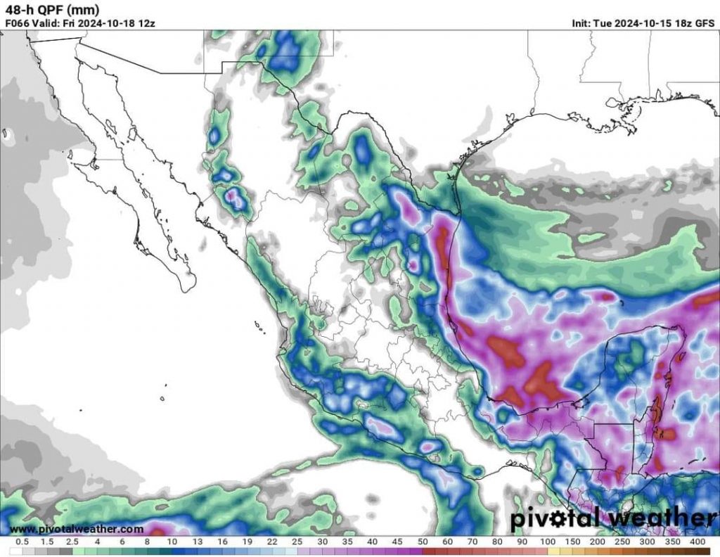 Conforme avance el sistema frontal hacia el oriente del país, las lluvias se incrementarán de manera fuertes a muy fuertes, especialmente en los siguientes estados: