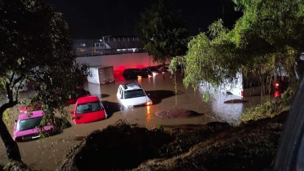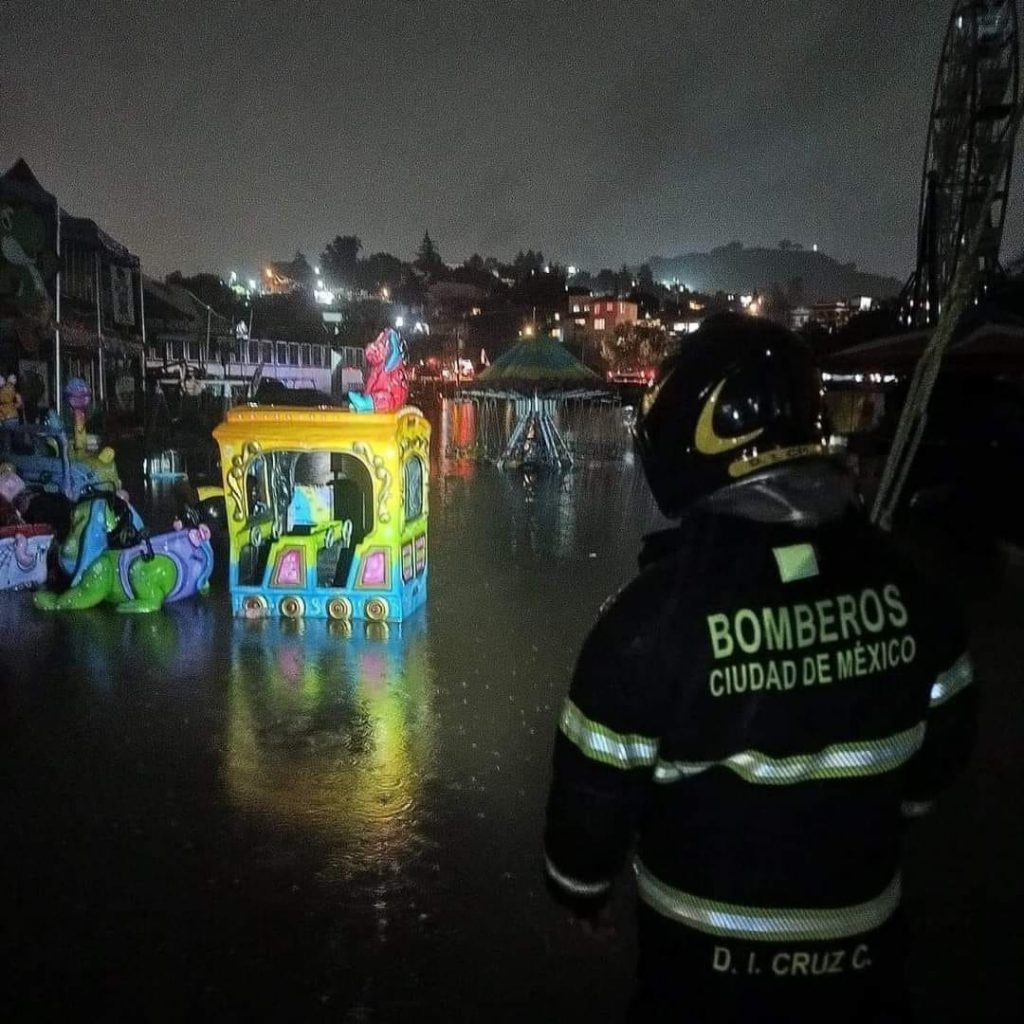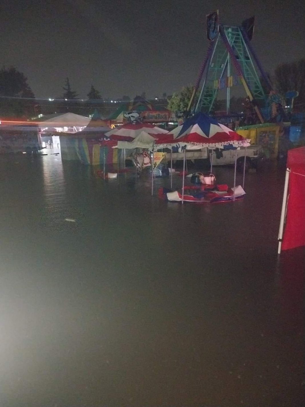 Fuerte inundación en la Feria del Mole en San Pedro Actopan, Ciudad de México, carros y juegos mecánicos quedaron bajo el agua que se acumuló tras las fuertes precipitaciones.