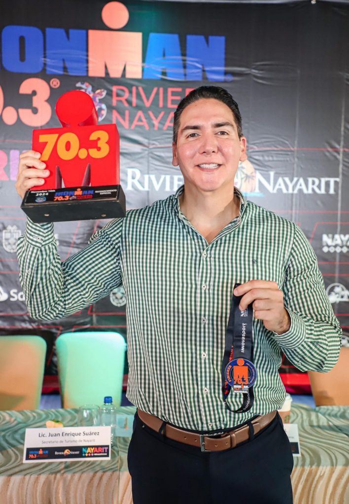 Durante su intervención, el secretario de Turismo, Juan Enrique Suárez del Real Tostado, destacó que la realización del Ironman 70.3 Riviera Nayarit se espera que genere una derrama económica de 73 millones 700 mil pesos, además de un importante impacto mediático. Subrayó la relevancia de Riviera Nayarit como un destino turístico internacional, asociado a marcas reconocidas como los Lakers, los Cowboys de Dallas y los Canucks de Vancouver, y adelantó que el próximo año se espera firmar acuerdos con los Yankees o los Dodgers.