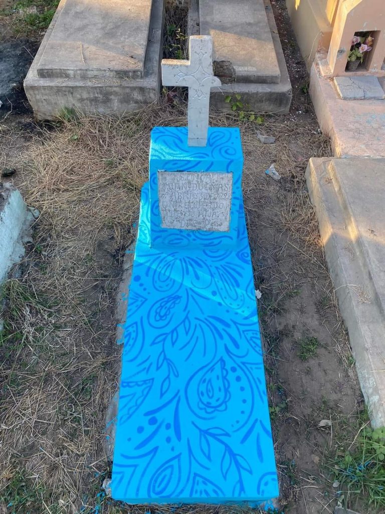 «El día de ayer me dio la inquietud de rescatar una tumba de una pequeña de nombre desconocido, pero hoy decidí hacer a un lado mis comisiones para tratar de rescatar más tumbas y me di la tarea de pintar más tumbas, se que no son los mejores diseños pero los hago con mucho respeto y cariño para todos aquellos que están de vuelta en el mundo terrenal hoy 2 de noviembre una de las tradiciones más importantes aquí en Mexico», publicó a través de sus redes sociales.