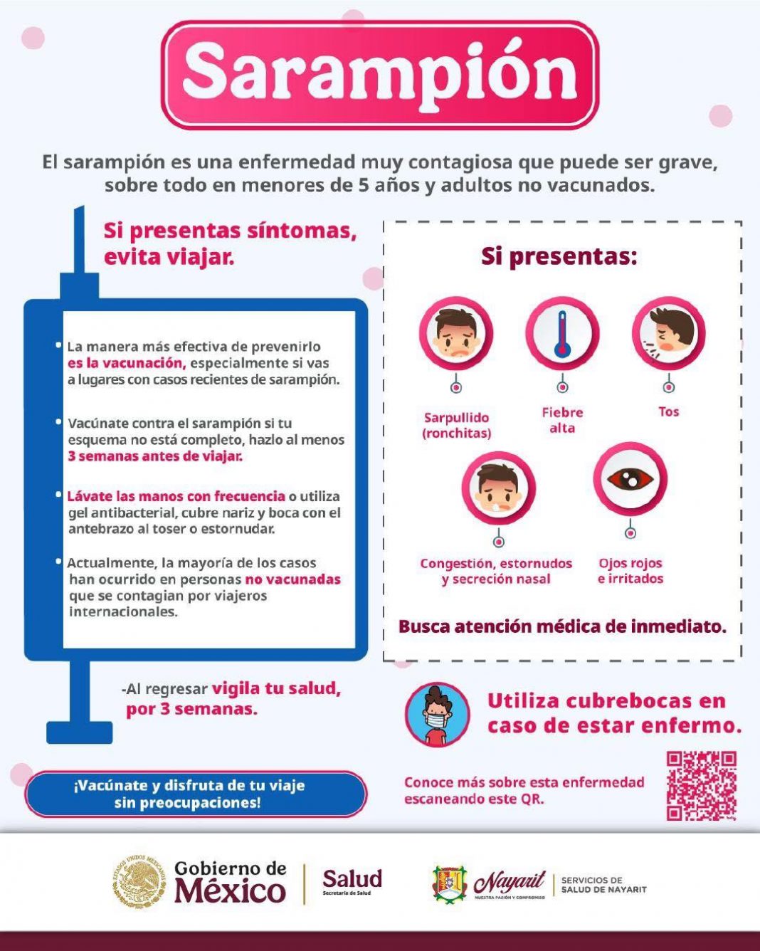 Los Servicios de Salud del Estado de Nayarit recordaron a la población que el Sarampión es una enfermedad prevenible a través de la vacunación, por lo que es importante mantener al día el esquema de inmunización en niñas y niños.