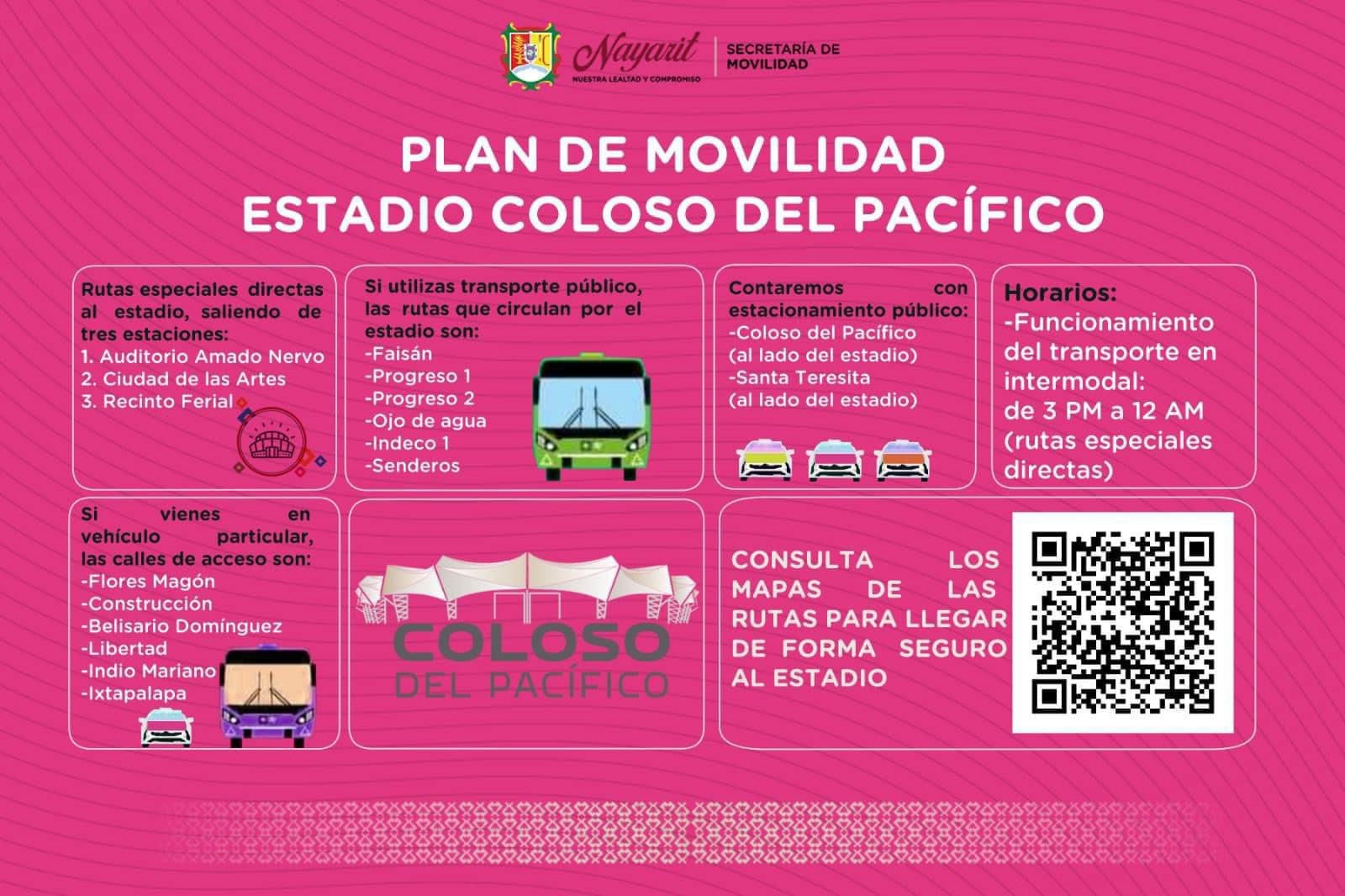 El gobierno del Estado de Nayarit encabezado por el doctor Miguel Ángel Navarro Quintero, pone a tu disposición el Plan de Movilidad que implementaremos a través de la Secretaría de Movilidad a partir del próximo miércoles 6 de noviembre, en el marco del juego inaugural del estadio Coloso del Pacífico en la ciudad de Tepic.
