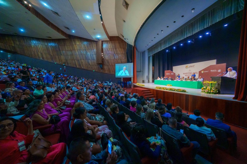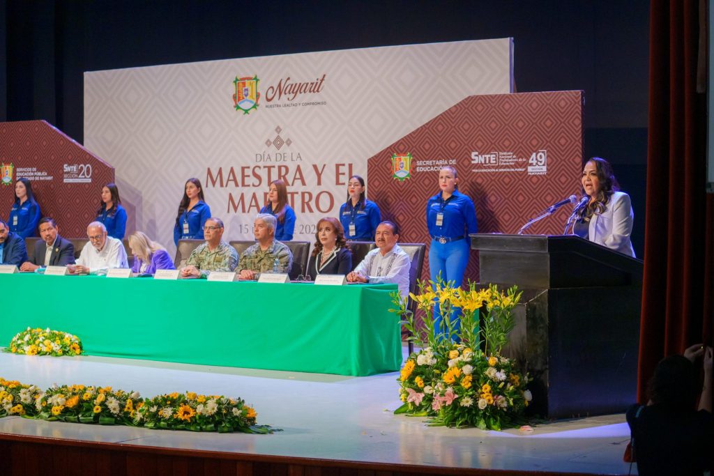 “Ciudadano gobernador del estado, doctor Miguel Ángel Navarro Quintero, su presencia fortalece esta celebración y refleja el interés de las instituciones públicas del estado por reconocer a sus maestras y maestros”, afirmó.