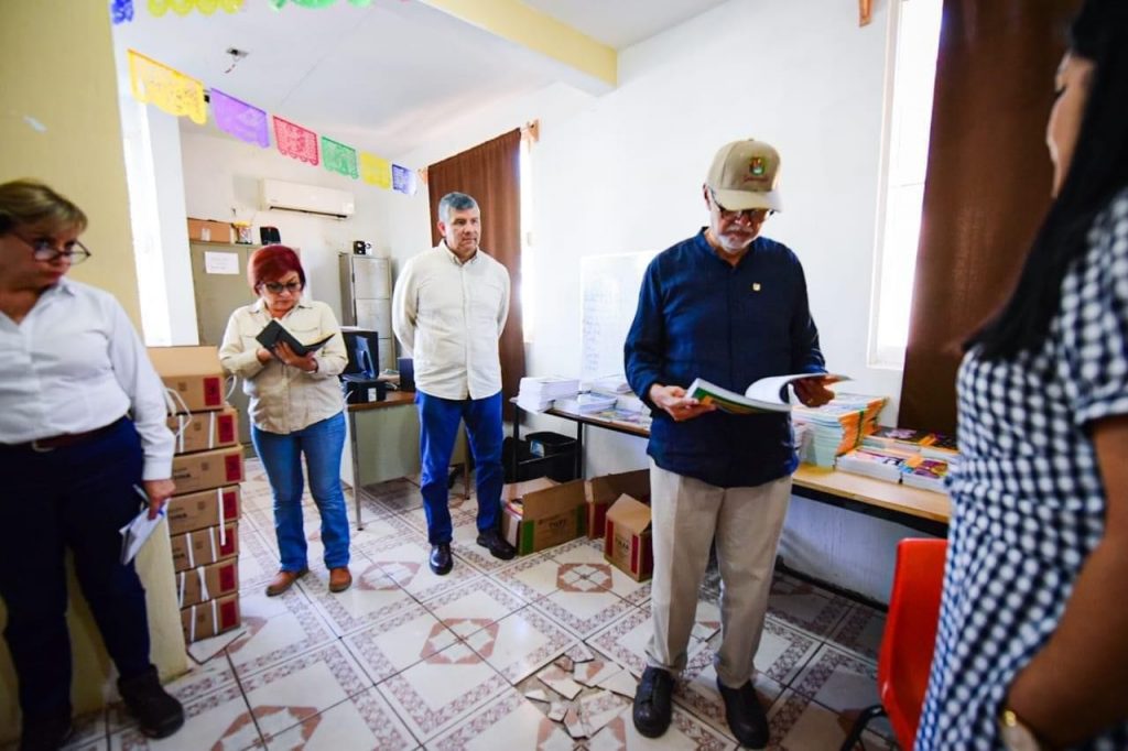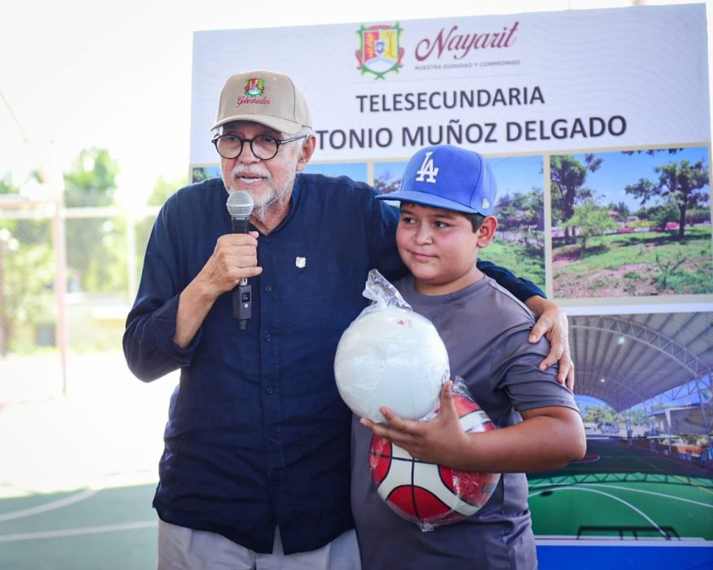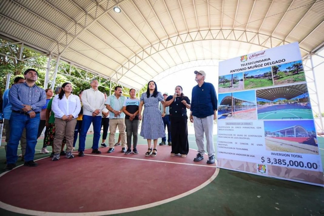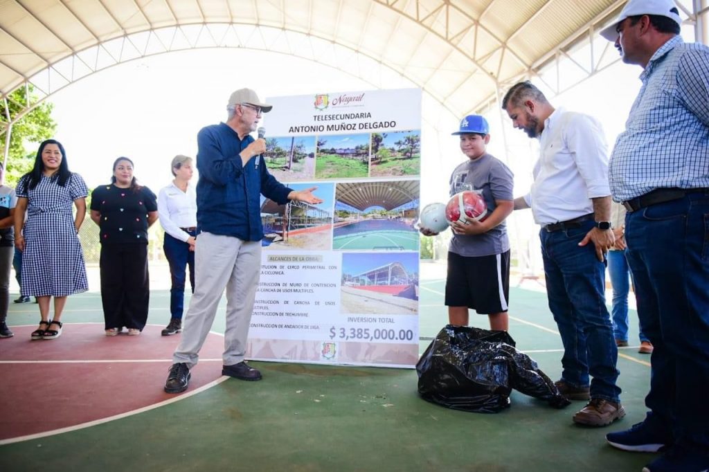 En gira de trabajo por el municipio de Santiago Ixcuintla, el gobernador del estado, Miguel Ángel Navarro Quintero, visitó la Telesecundaria «Antonio Muñoz Delgado», de la localidad de Puerta Azul, donde se construye un cerco perimetral con malla ciclónica, un muro de contención en la cancha de Usos Múltiples, la techumbre y un andador de liga, obra que viene a beneficiar a las y los jóvenes que ahí estudian.
