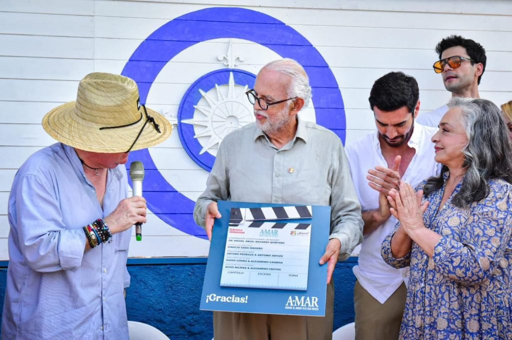 El gobernador del estado de Nayarit, Miguel Ángel Navarro Quintero, visitó La Peñita de Jaltemba, en el municipio de Compostela, donde ha comenzado la grabación de la nueva telenovela de Televisa Univisión, *A•MAR*. Esta producción, protagonizada por Eva Cedeño y David Zepeda, cuenta con la participación de la querida actriz Ana Martín y Víctor González, bajo la dirección del productor Nacho Sada.