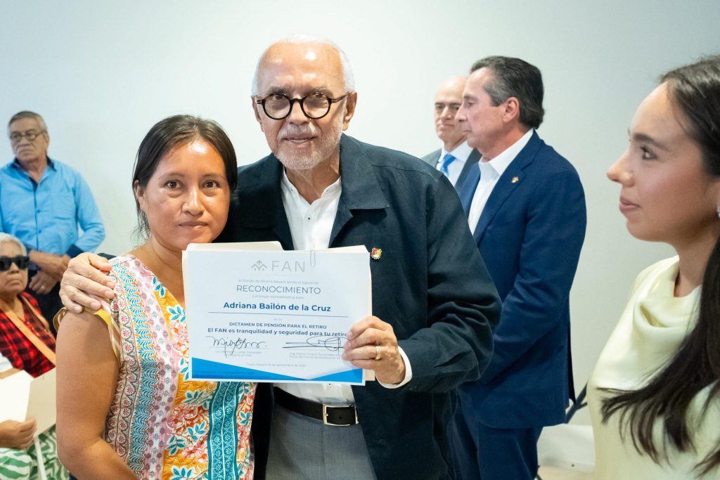 “Hoy tenemos alrededor de 515 millones de pesos en el Fondo de Ahorro de Nayarit, 515 millones de pesos, que hace legítimo un derecho, un derecho que dejó el esposo, un derecho para los hijos, un derecho para qué comer el día de mañana, yo quisiera que esas personas pensaran en ese derecho. Agradezco a todos y todas las que colaboran en el FAN, no ha sido fácil, pero las cosas difíciles las tiene que enfrentar alguien, para hacer contrapeso a los que actúan mal, debemos hacer un contrapeso con los que actuamos bien por Nayarit, así es que el día de hoy yo vengo a entregar estas primeras constancias que garantizan ya las pensiones para ustedes, no saben lo feliz que me hacen”, expresó el doctor Navarro Quintero.