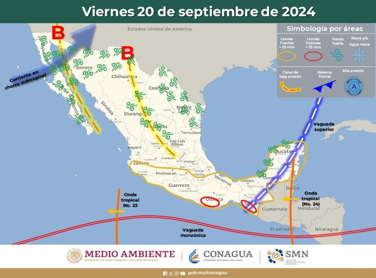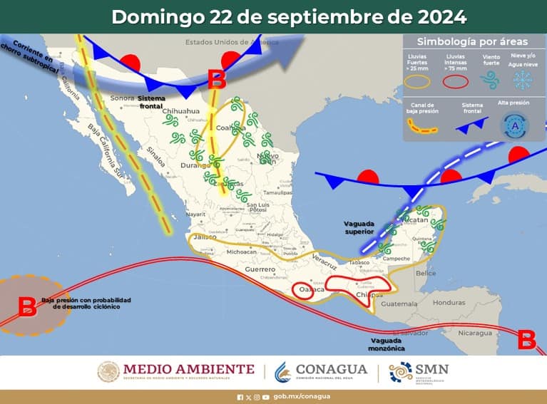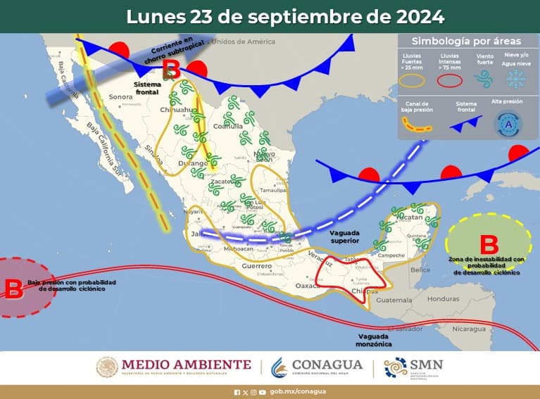 Intervalos de chubascos con lluvias puntuales fuertes (25 a 50 mm): Chihuahua, Durango, Sinaloa, #Nayarit, Jalisco, Colima, Michoacán, Nuevo León, Tamaulipas, San Luis Potosí, Puebla y Yucatán.