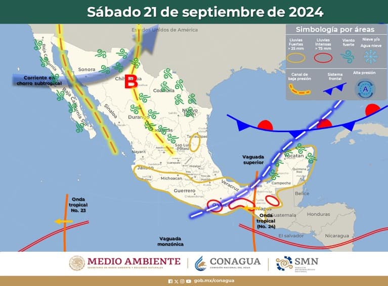 Intervalos de chubascos (5 a 25 mm): Chihuahua, Coahuila, Nuevo León, Zacatecas, Durango, Sinaloa, #Nayarit, Guanajuato, Querétaro, Hidalgo, Tlaxcala y Ciudad de México.