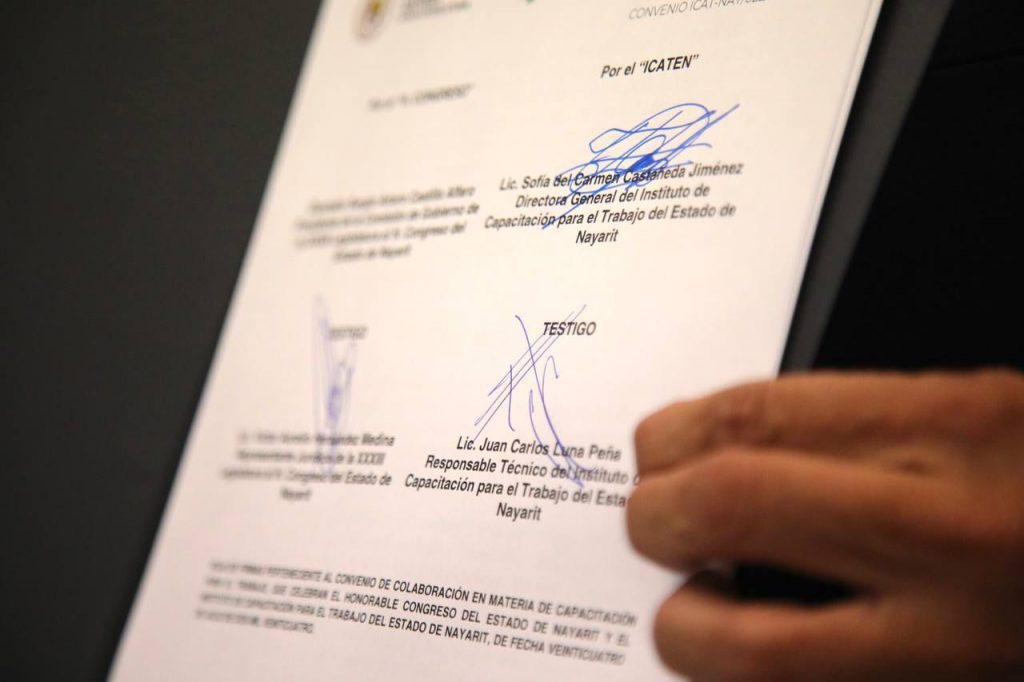 Tepic, 24 de julio de 2024.- Con el interés de fomentar y promover la capacitación entre las y los trabajadores de la Cámara de Diputados para que adquieran conocimientos, habilidades y competencias laborales, la Trigésima Tercera Legislatura firmó convenio de Colaboración con el Instituto de Capacitación para el Trabajo del Estado de Nayarit.