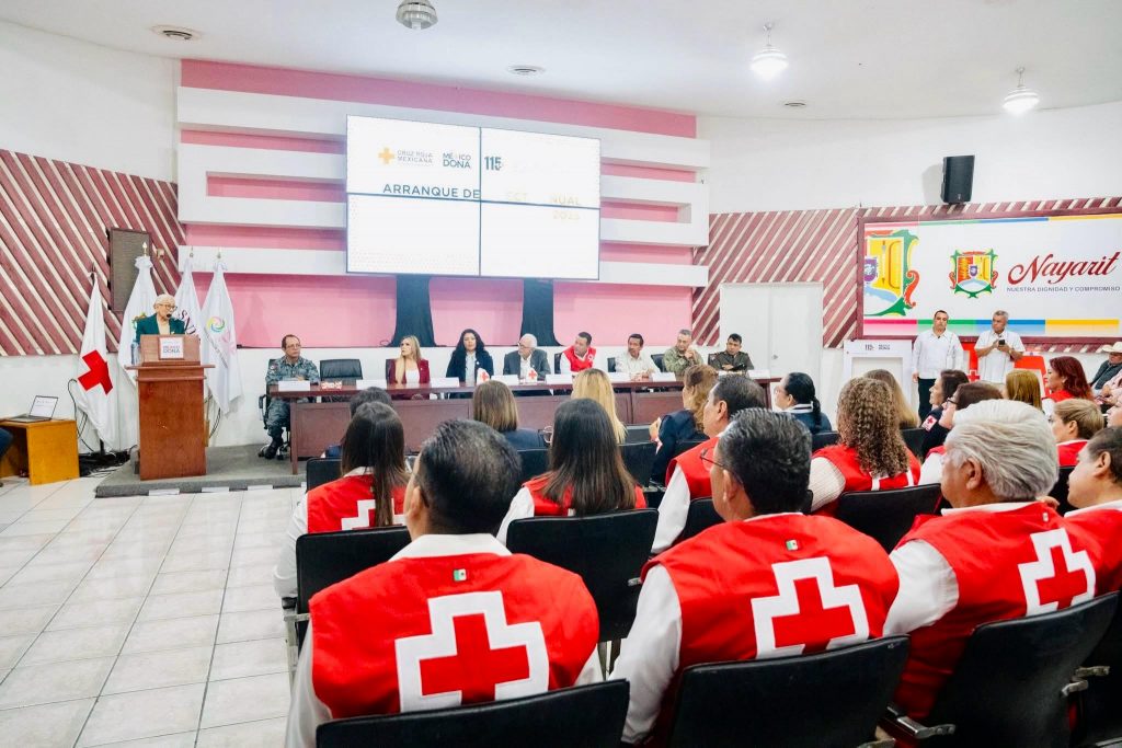 El gobernador Miguel Ángel Navarro, Quintero, en compañía de su esposa, la presidenta del sistema DIF Nayarit, Beatriz Estrada Martínez, encabezaron el arranque de la Colecta Anual de la Cruz Roja Mexicana 2025, en las instalaciones del DIF Estatal.
