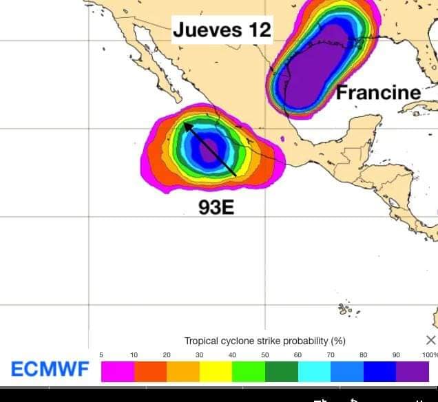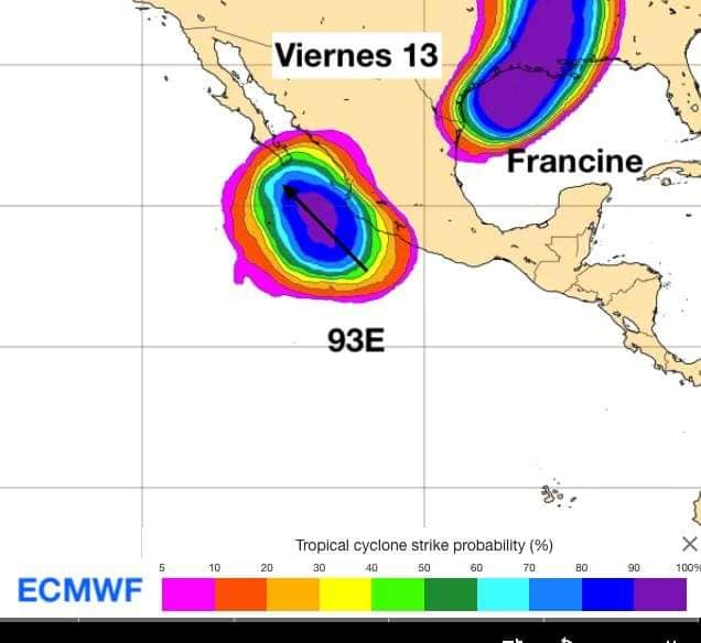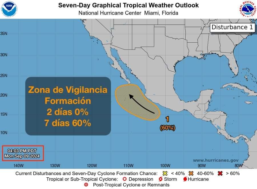 La zona de vigilancia sobre el Pacífico mexicano, se prevé se convierta en el disturbio tropical 93E para mediados de la semana, se desplazará cercano y paralelo a las costas de Michoacán, Colima, Jalisco, Nayarit y Sinaloa, mientras se desplaza rumbo a las costas de Baja California Sur. Podría evolucionar en la depresión tropical “Nueve-E” para finales de esta semana.