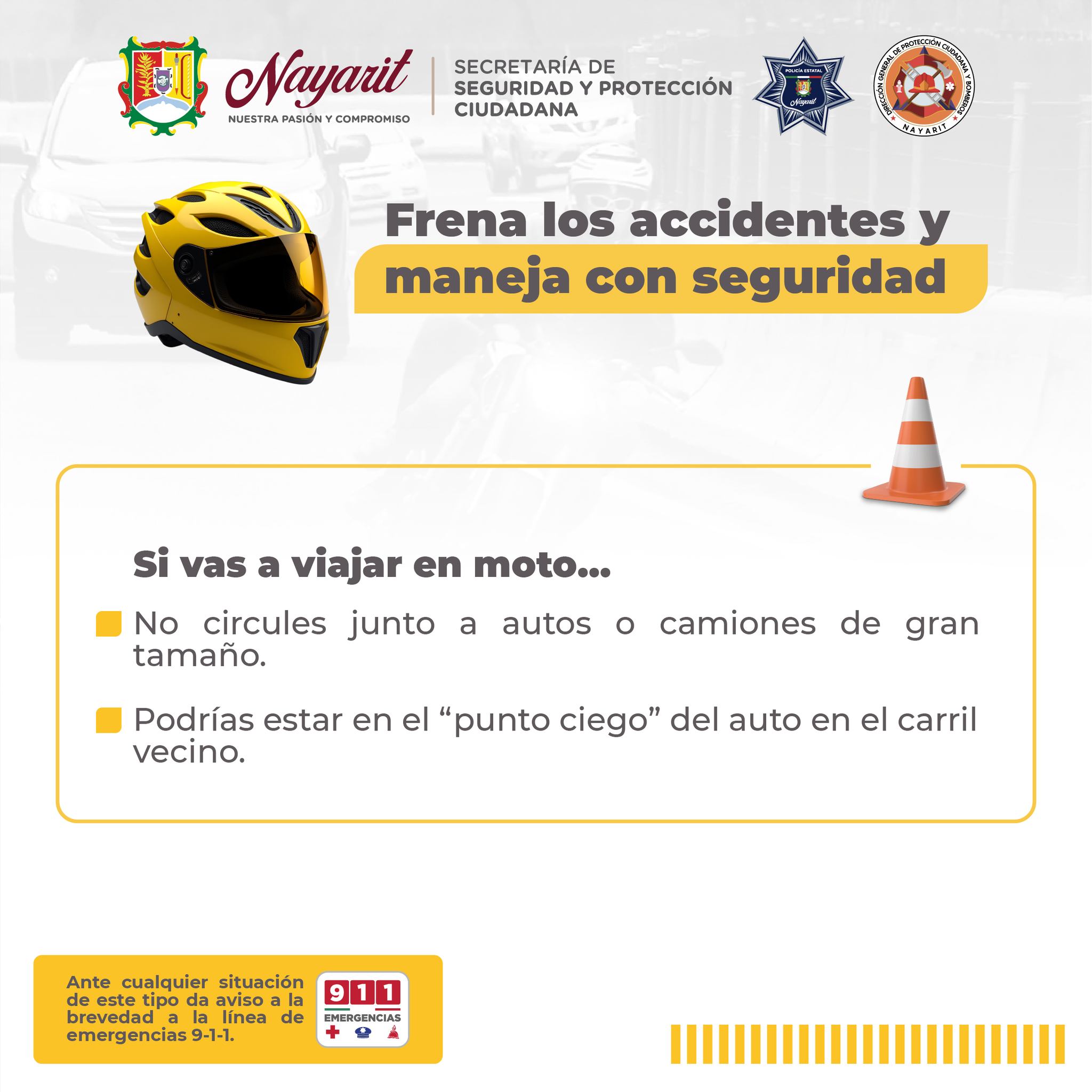 Con el objetivo de fortalecer la seguridad vial y prevenir accidentes, autoridades del Gobierno del Estado de Nayarit exhortan a las y los motociclistas a utilizar casco de protección de manera correcta y permanente al conducir.
