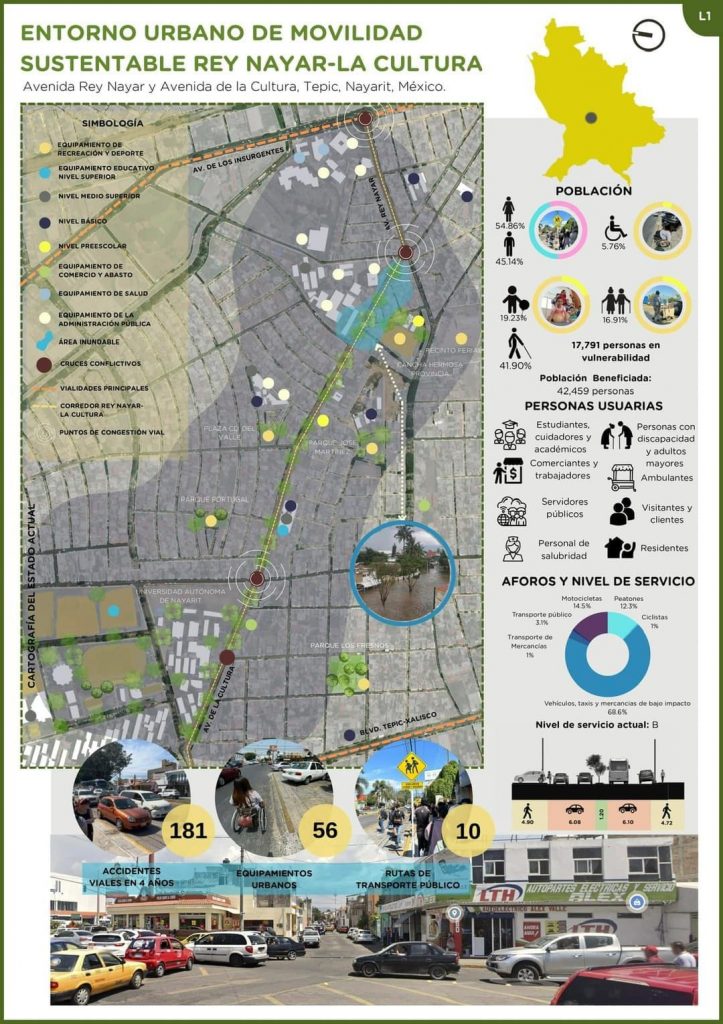 Cruces seguros, jardines pluviales, rampas para discapacitados, alumbrado público, banquetas amplias, entre otras mejoras, son sólo algunas de las modificaciones que se realizarán en el cruce de avenida Insurgentes y Rey Nayar de la ciudad de Tepic, y que se plasmaron en el proyecto presentado por la Secretaría de Movilidad dentro del concurso “Mejores Calles para México”, organizado a nivel nacional por el Instituto de Políticas para el Transporte y Desarrollo (ITDP) México en colaboración con CEMEX.