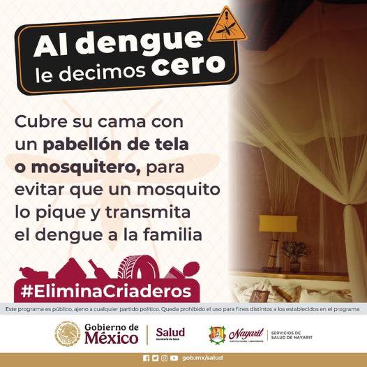 Los Servicios de Salud del Estado de Nayarit exhortaron a la población a reforzar las medidas de prevención contra el Dengue, revisando en sus viviendas objetos que puedan acumular agua, como llantas, baldes, bebederos y recipientes en desuso, ya que pueden convertirse en criaderos del mosquito transmisor.