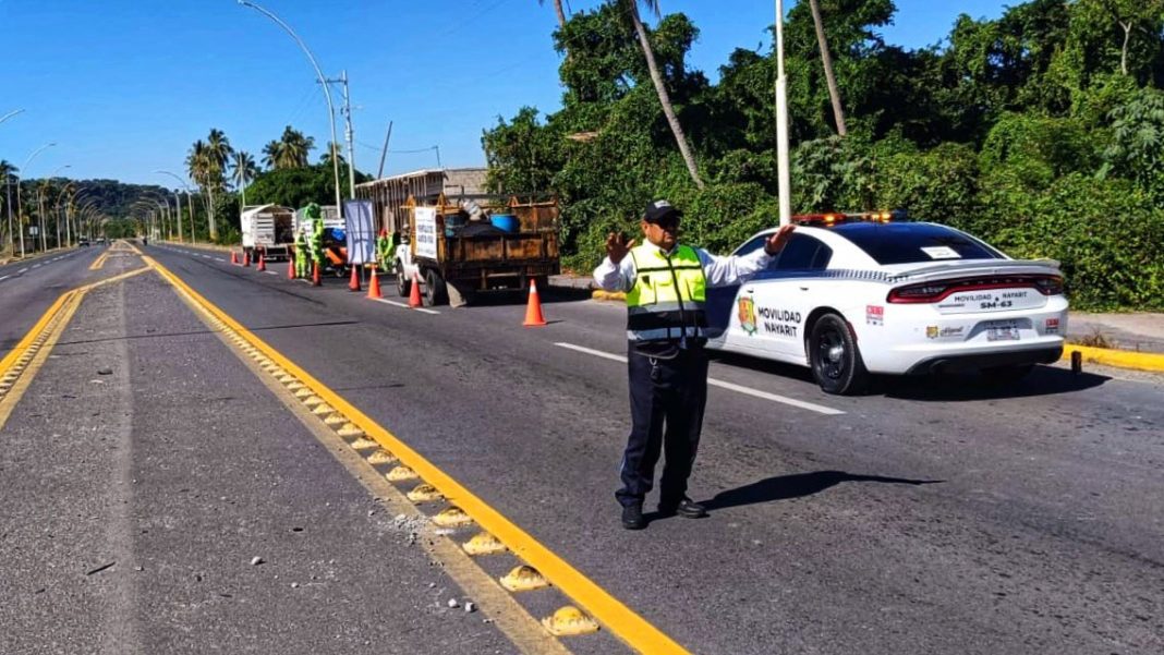 Agentes de la Secretaría de Movilidad del Estado de Nayarit brindaron apoyo vial en el Bulevar Matanchén tras el hundimiento registrado en el kilómetro 2+800.