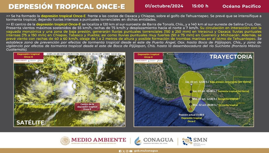 La Depresión Tropical Once-E se ha formado frente a las costas de Chiapas y Oaxaca, generando condiciones climáticas adversas para varias regiones del país. Según el Servicio Meteorológico Nacional (SMN), este sistema traerá consigo chubascos intensos y lluvias fuertes, acompañadas de descargas eléctricas y posibles granizadas, especialmente en zonas del occidente de México.