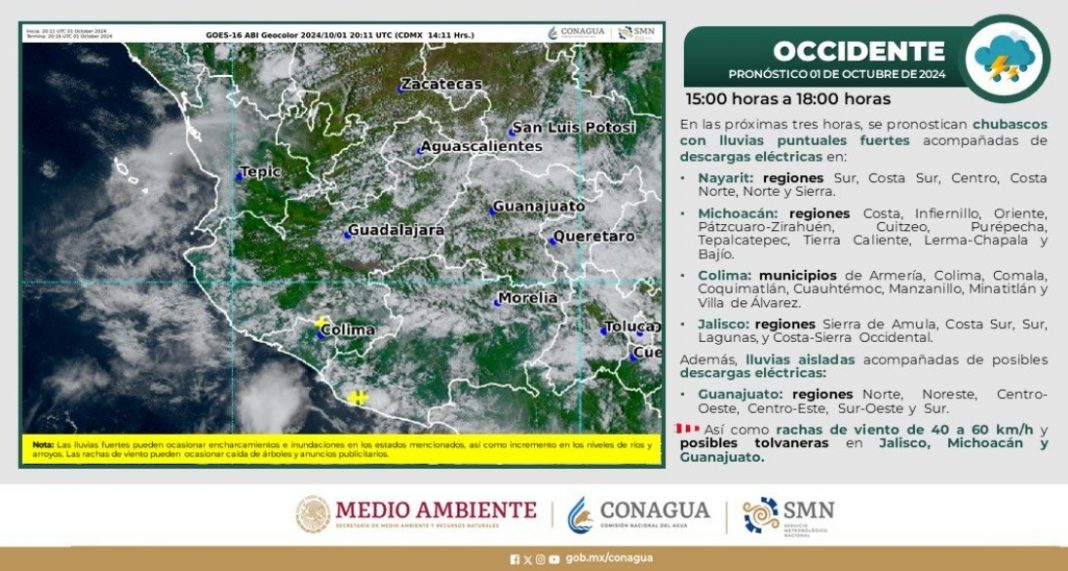 Se prevé que las lluvias afecten principalmente los estados de Jalisco, Colima, Michoacán y Guerrero, donde se recomienda a la población tomar precauciones ante posibles inundaciones y deslaves. Las autoridades de Protección Civil mantienen un monitoreo constante y exhortan a los habitantes a estar atentos a los avisos meteorológicos.