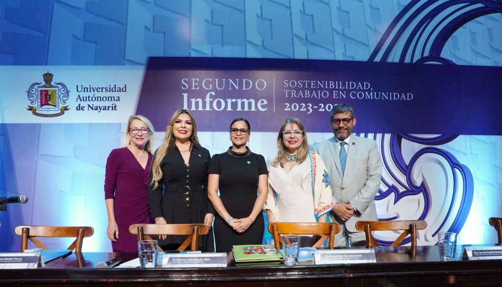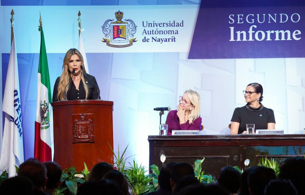 En representación del gobernador del estado, Miguel Ángel Navarro Quintero, la secretaria general de Gobierno, Rocío Esther González García, estuvo presente en el Segundo Informe de Actividades de la rectora de la Universidad Autónoma de Nayarit, Norma Liliana Galván Meza. Donde se resaltaron los logros en materia educativa, deportiva, científica y en cada uno de los rubros donde la máxima casa de estudios tiene gran presencia dentro y fuera del país.