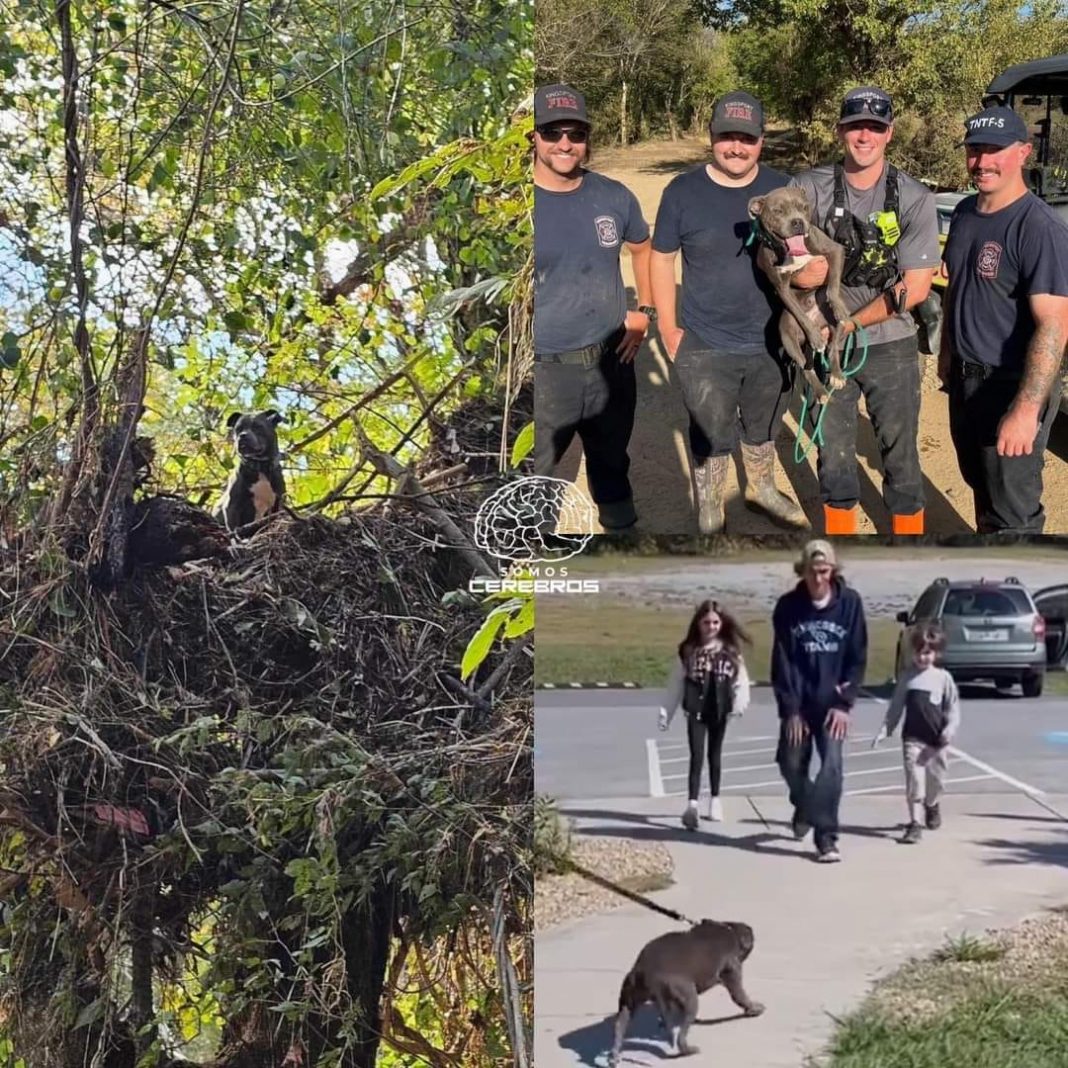 Un grupo de Bomberos del estado de Tennessee rescataron a un perrito atrapado en un árbol de 6 metros de altura durante las inundaciones causadas por el devastador huracán Helene.